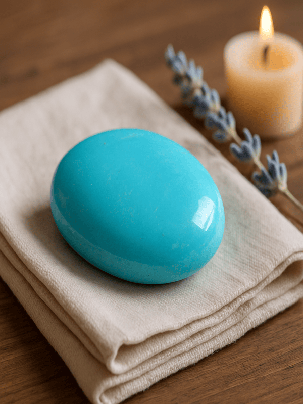 Create a calming corner with candles, lavender oil, and your turquoise stone. It sets a peaceful tone for sleep.